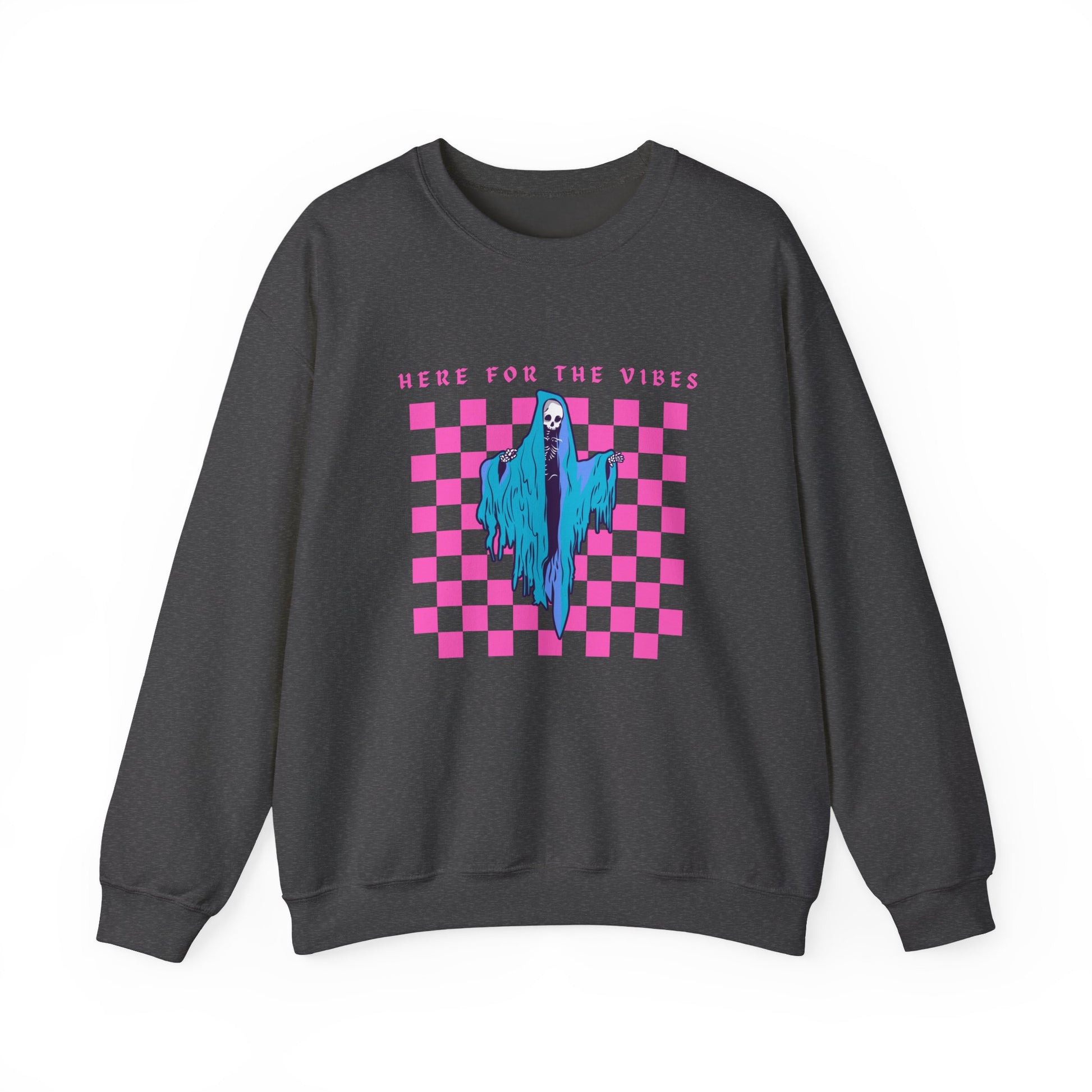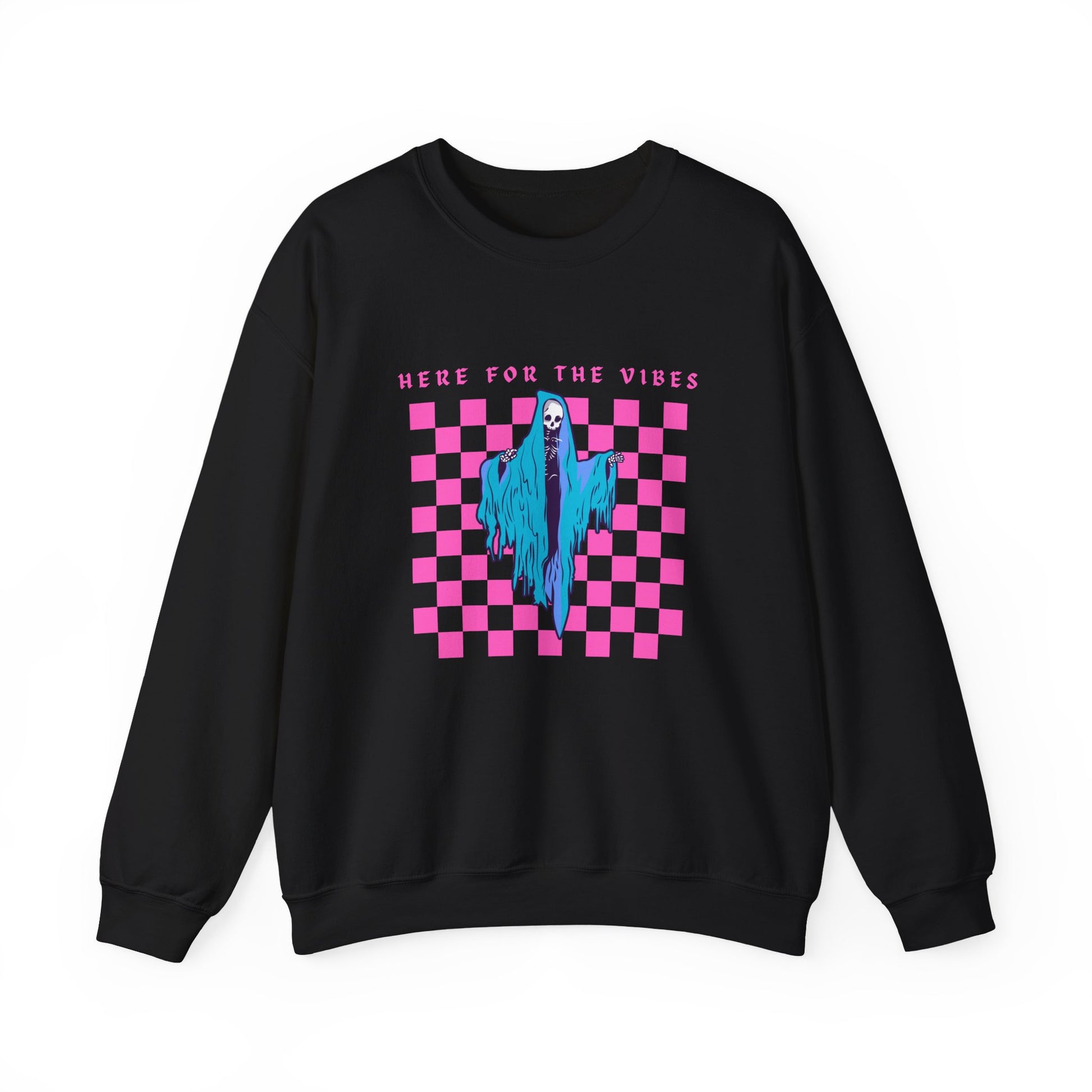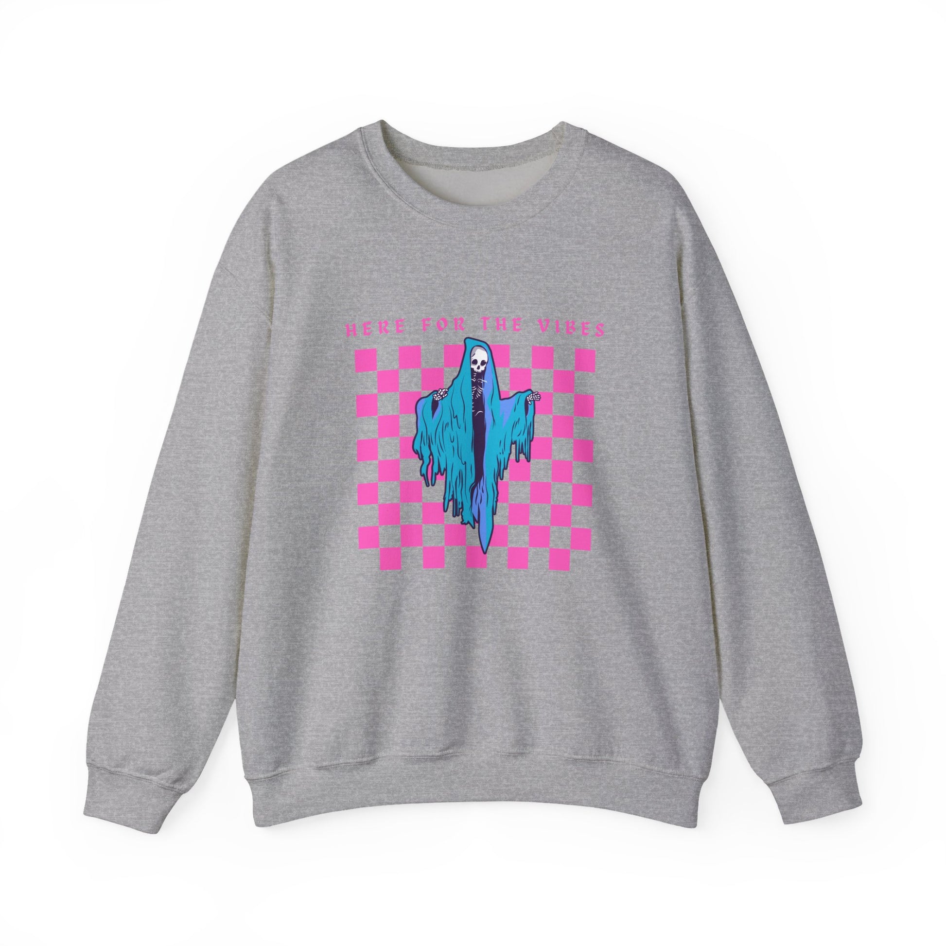Oversized 'Here for the vibes' sweatshirt featuring a picture of the grim reaper. Perfect for those looking for a cozy and edgy look.