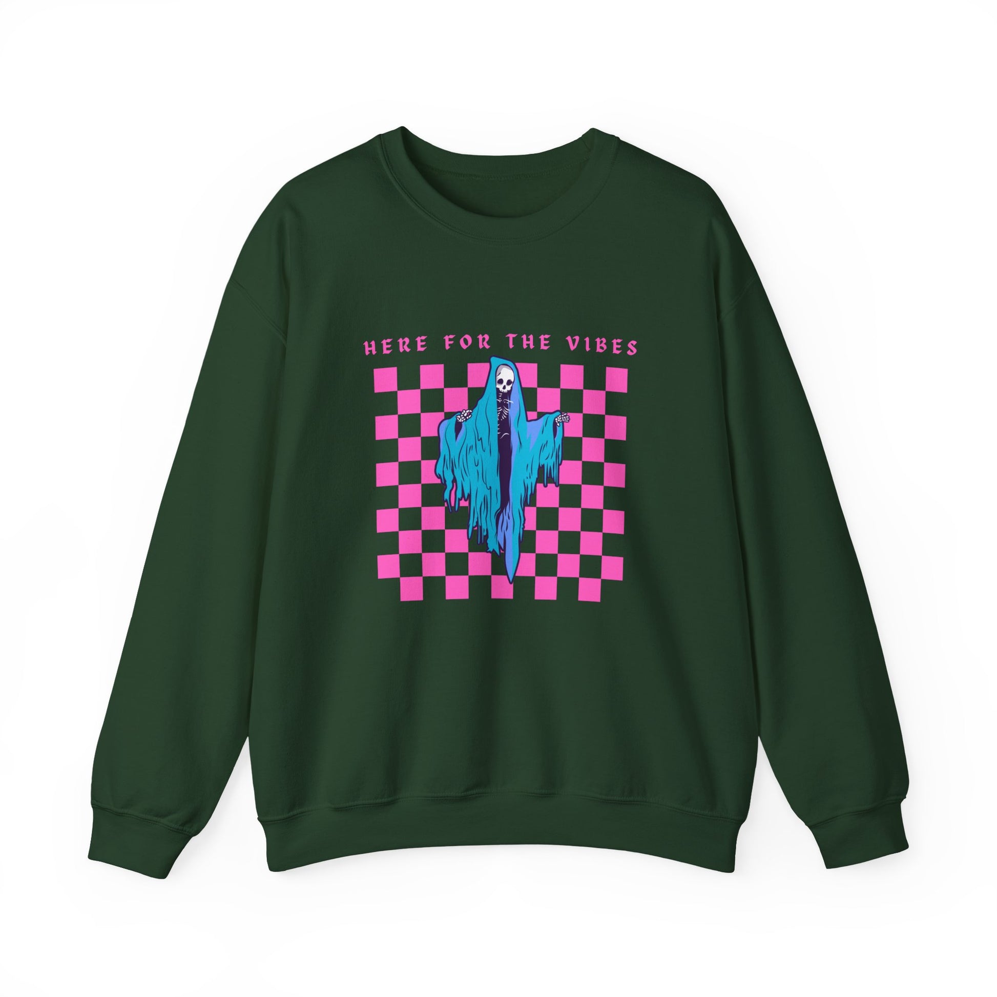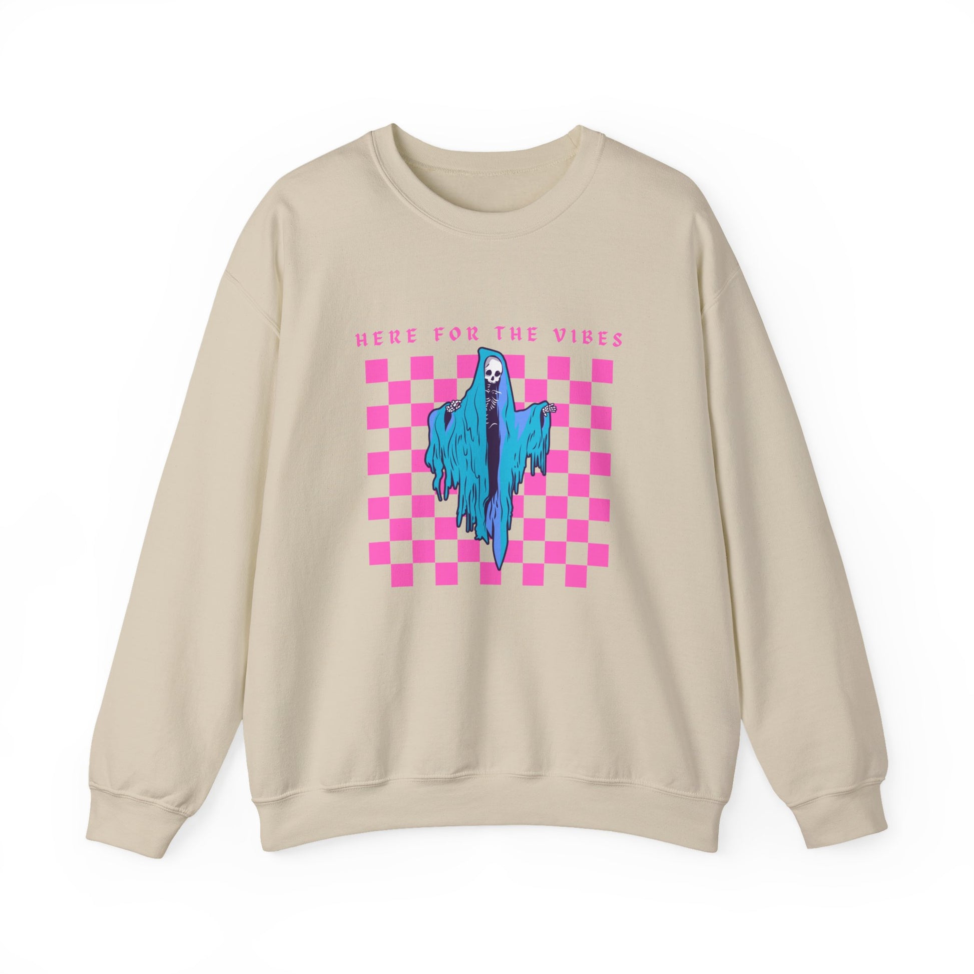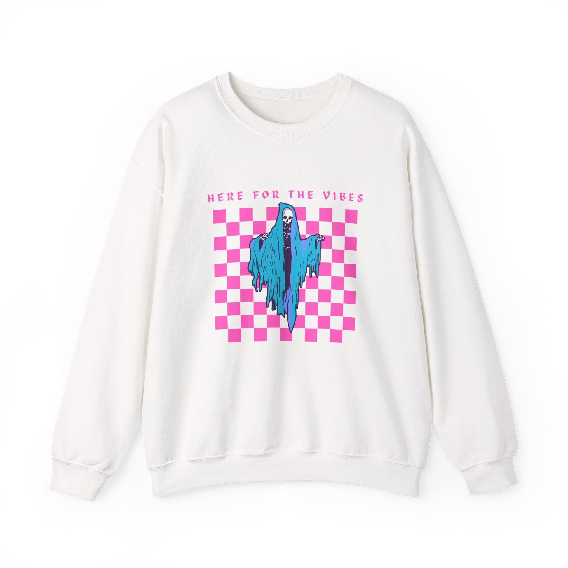 Oversized 'Here for the vibes' sweatshirt featuring a picture of the grim reaper. Perfect for those looking for a cozy and edgy look.