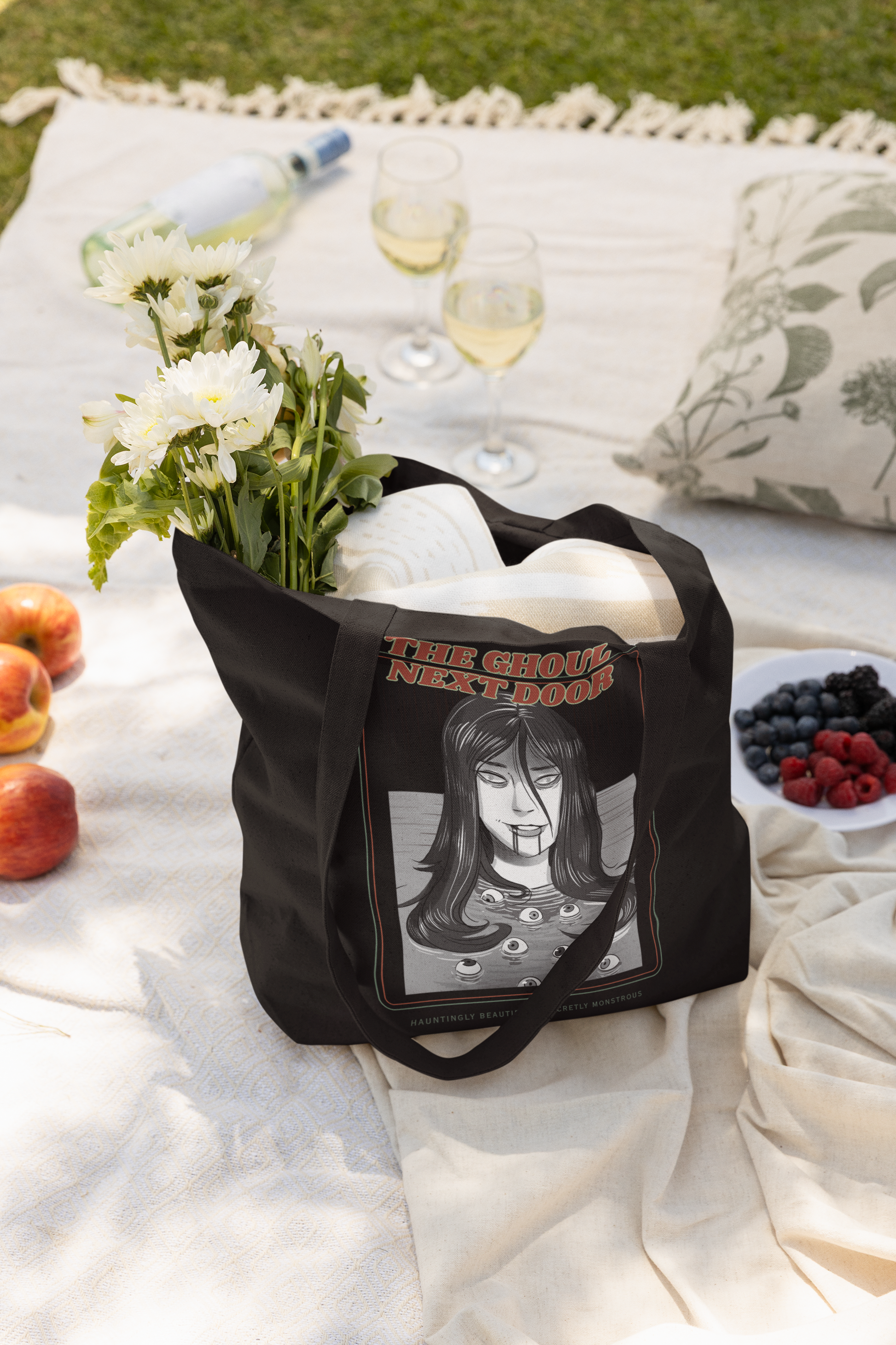 #GhoulNextDoor #SpookyCuteStyle #GothicToteBag #AltFashionAccessories #EcoChicBag #SpookyStyle #AlternativeFashion #GhoulVibes #DarkAesthetic #EverydayCarryBag